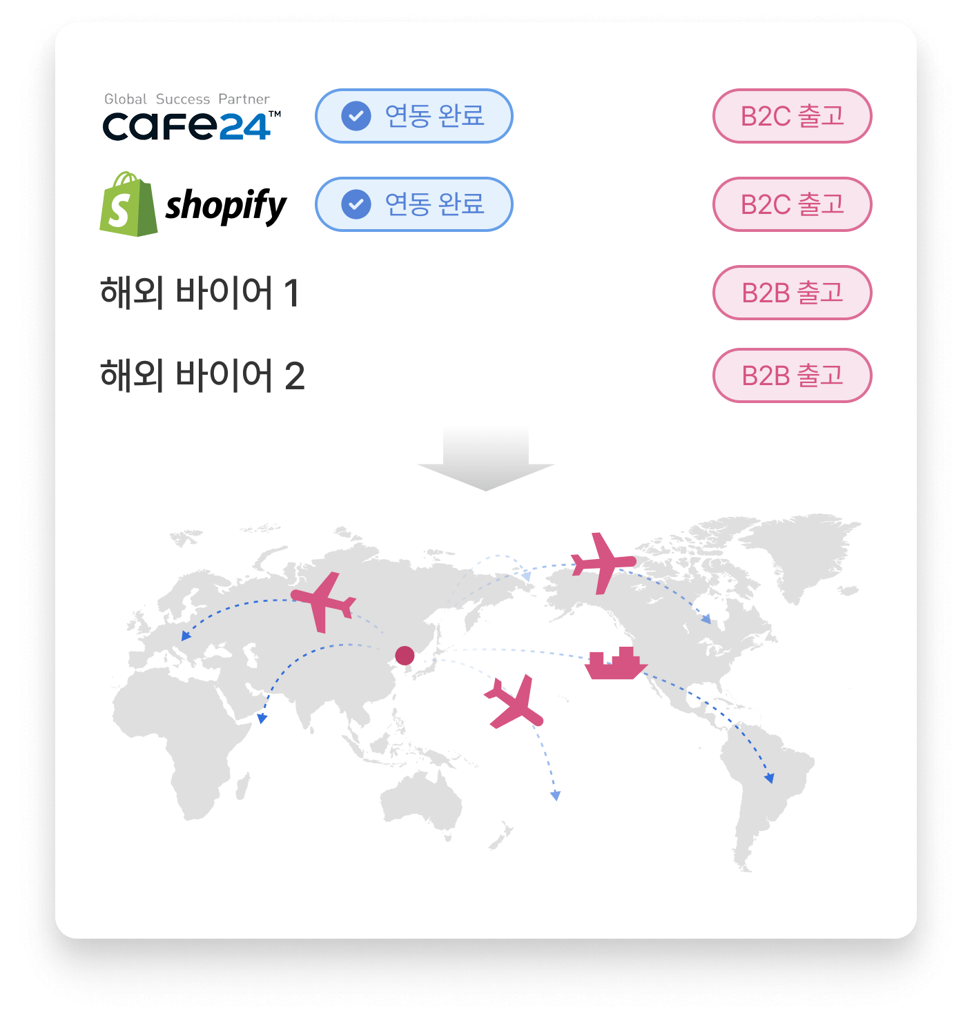 Shopify, Cafe24 Global 등 다양한 마켓플레이스 연동을 통한 B2C 해외 출고 뿐만 아니라, 해외 바이어에게 납품하는 B2B 운송도 가능합니다.