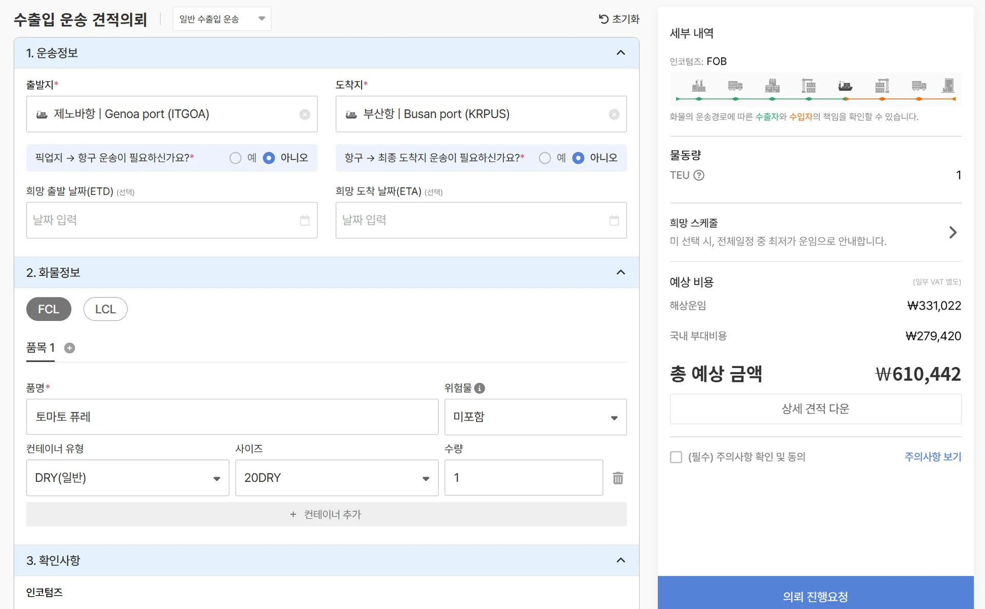 수출입 운송에 있어 가장 중요한 요소 중 하나죠. 바로 “운송료”인데요. 디지털 포워더의 장점은 온라인 확장성을 기반으로 많은 고객사의 화물을 취급하다보니, 견적 그 자체가 강력합니다. 특히 서비스 개시 6년차에 접어든 [디지털 포워딩 - 쉽다]의 경우, 한국을 대표하는 대기업의 화물도 직접 취급하고 있습니다. 이에 운송 파트너인 “해운사, 항공사”로부터 경쟁력 있는 운임을 계약하여, 작은 물량을 보유한 고객사더라도 경쟁력 있는 운임을 제공하고 있습니다.
