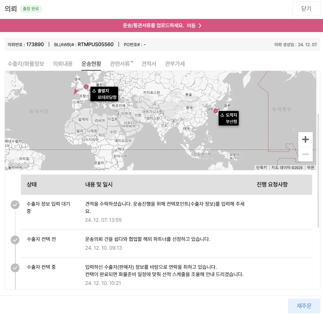 내 상품의 운송현황을 확인하기 위해서 “포워더(한국)” 담당자에게 문의합니다.