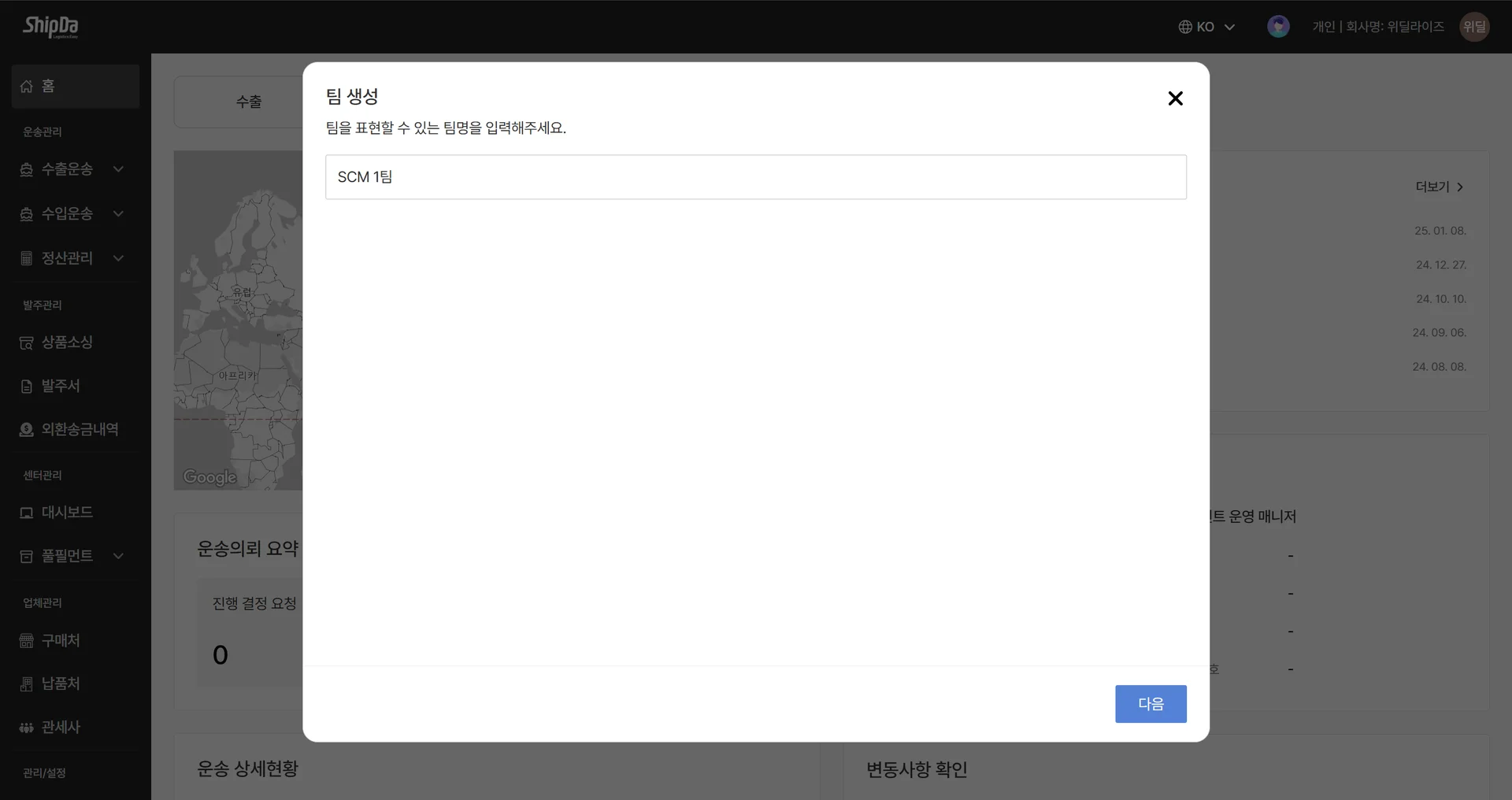 프로필 사진을 클릭하시면 ‘팀 생성’ 버튼을 확인하실 수 있는데요. 이를 클릭합니다. 1개 계정에 팀은 N개를 만들고, 초대될 수 있는데요. 다양한 거래처가 있다면 하나의 계정으로 여러 거래처와의 운송현황을 공유하며 사용할 수 있겠죠.