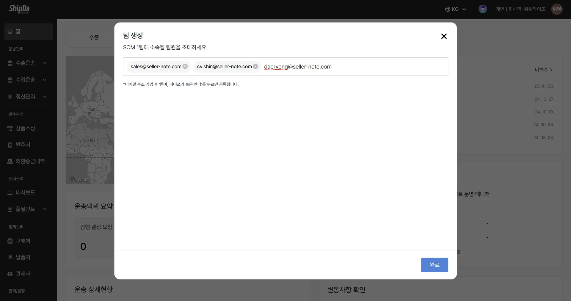 팀에 초대할 멤버 이메일 주소를 입력해주세요. 이후 완료버튼을 클릭하세요.