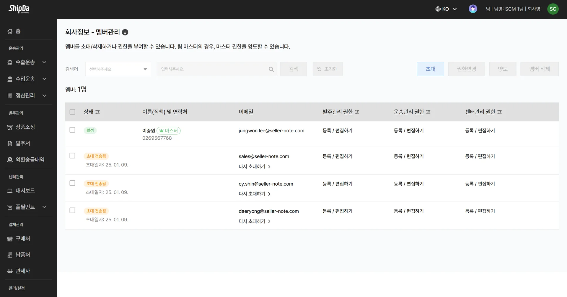 초대를 받은 멤버가 쉽다에 가입 및 초대를 수락하면, ‘초대 전송됨’ 상태값이 ‘활성’으로 변경됩니다.