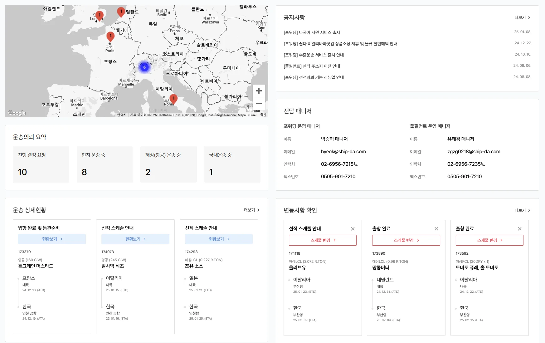 전세계 수출입 운송현황을 ‘지도’ 형태로 가시적으로 확인할 수 있습니다. 또한 운송의뢰 현황을 요약해 확인할 수 있습니다. 그리고 이슈가 되는 ‘변동사항’에 대해 실시간으로 체크할 수 있는 점이 특징입니다.