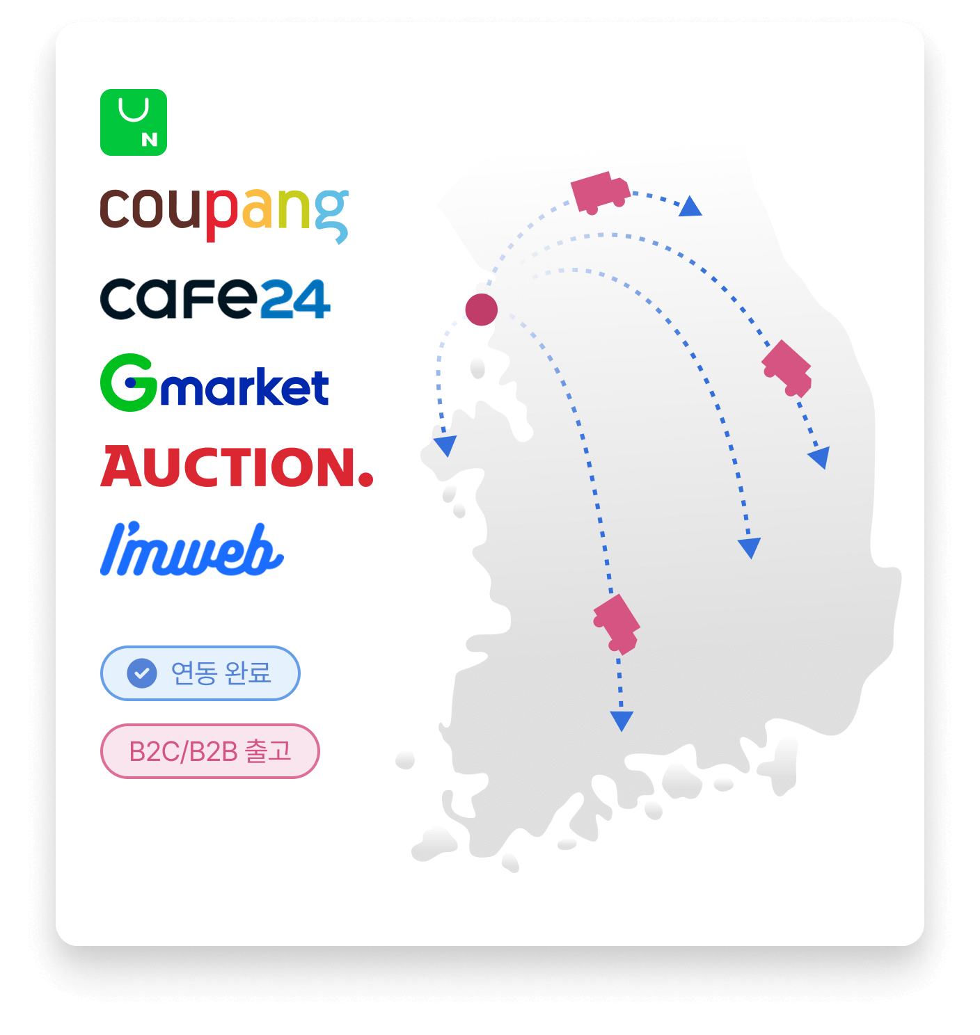 Integration with various shopping platforms like Smart Store, Coupang, and Cafe24 is available. Simplify B2C/B2B domestic shipping with Shipda.