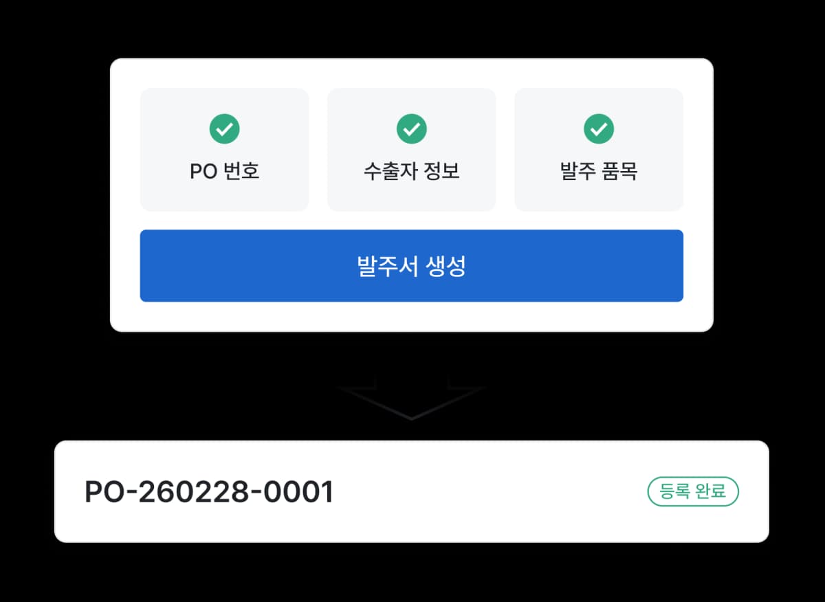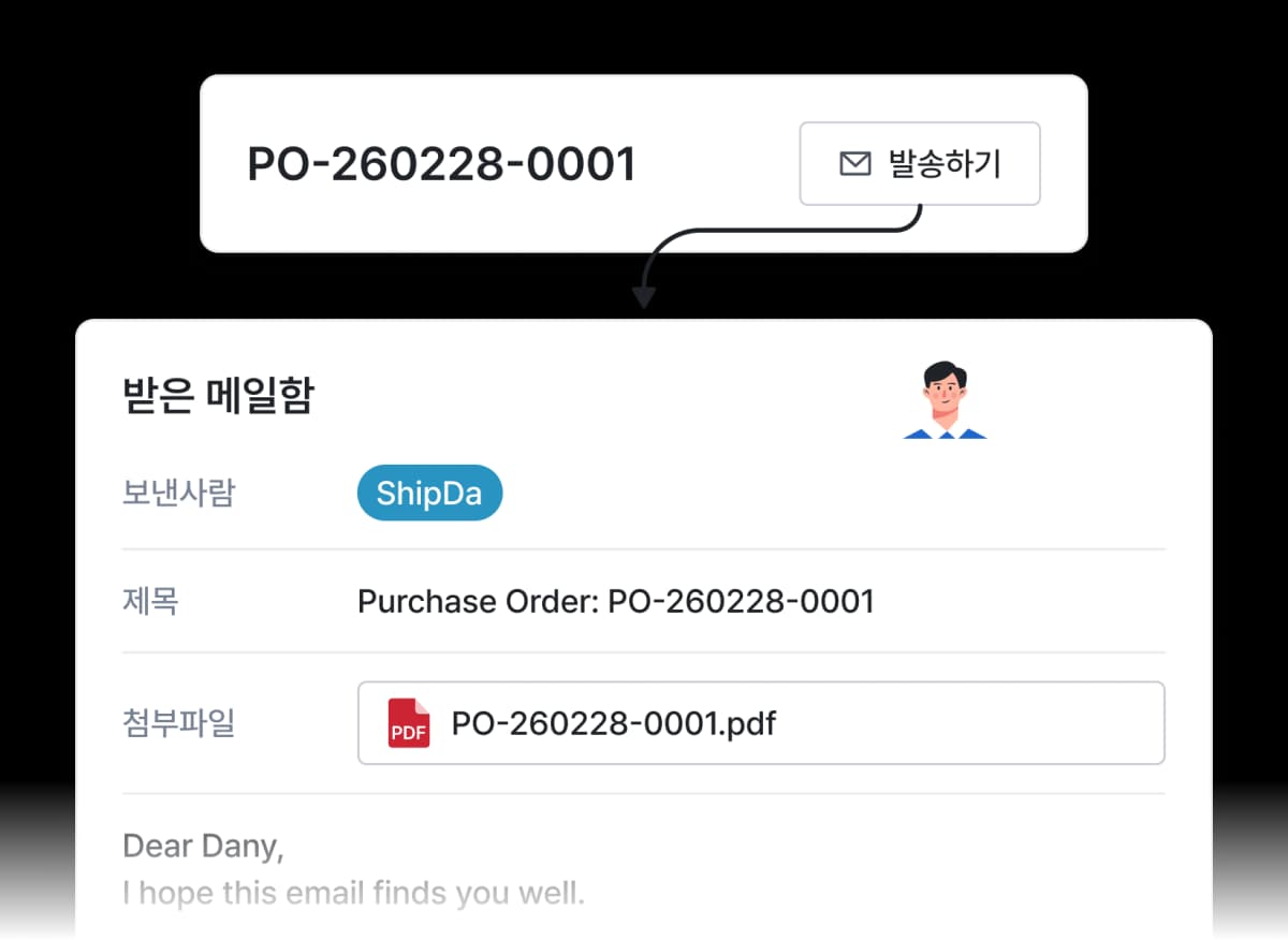 버튼 하나로 수출자에게 발주서가 바로 발송됩니다.