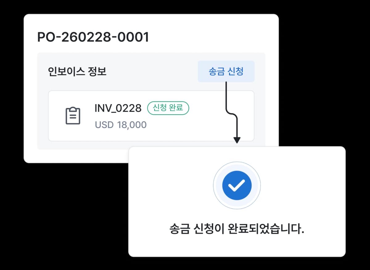 송금도 발주서 흐름 안에서 처리됩니다.